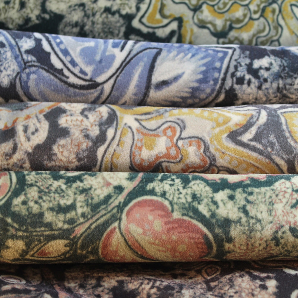 Stunning floral large repeat print on velvet. This cozy fabric will add warmth, depth and texture to any environment. Reminiscent of vintage art nouveau wallpaper. Cadenza has a high wear rating and the content will allow for easy clean up of spills and spots.