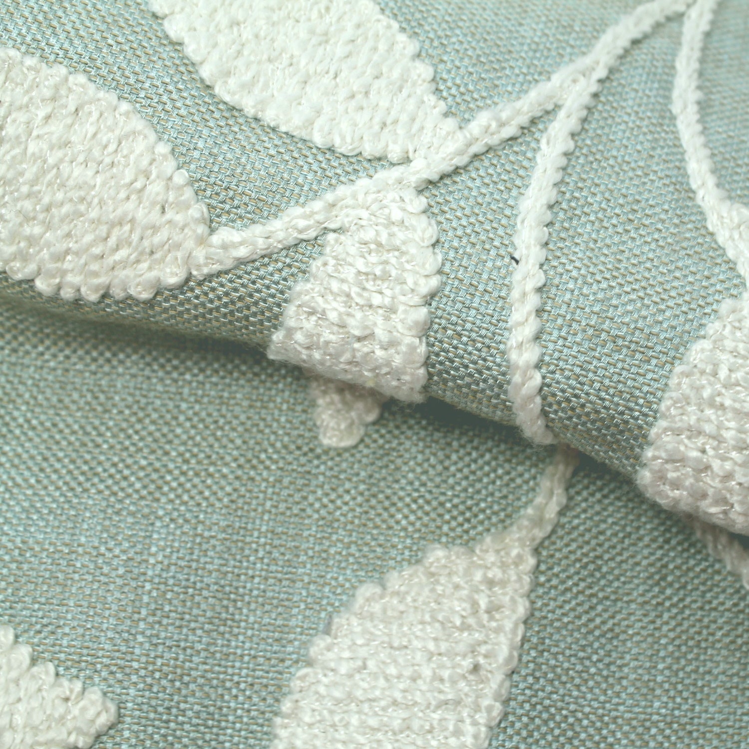 This is the fabric to quietly elevate your interior from plain to luxurious. The woven backing cloth has a chenille or tufted leaf motif which is drapey and weighted. The chenille embroidered leaf motif is quite heavy adding a sumptuous quality to this fabric. Stunning for upholstery. Drapes just touching to the floor will bring out the beauty of this fabric.