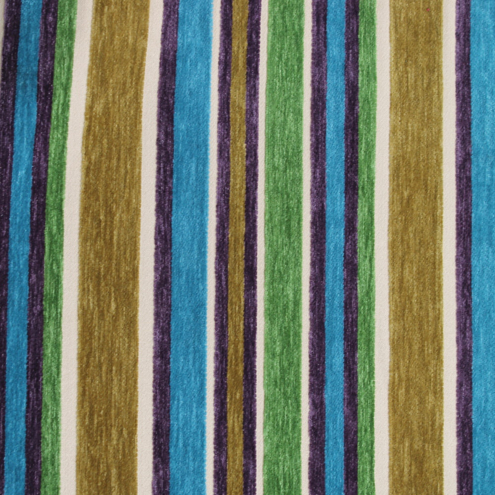 Paladin is a bold multicolor wide stripe, reminiscent of awning fabric. It differs in the texture, the stripes being a heavy brushed chenille and the background being a smooth textured cloth. This is a sold and thick fabric that should hold up really well. Polyester offers good stain resistance so cleaning should not be an issue.