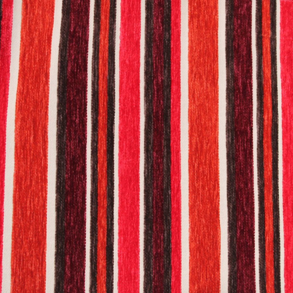 Paladin is a bold multicolor wide stripe, reminiscent of awning fabric. It differs in the texture, the stripes being a heavy brushed chenille and the background being a smooth textured cloth. This is a sold and thick fabric that should hold up really well. Polyester offers good stain resistance so cleaning should not be an issue.