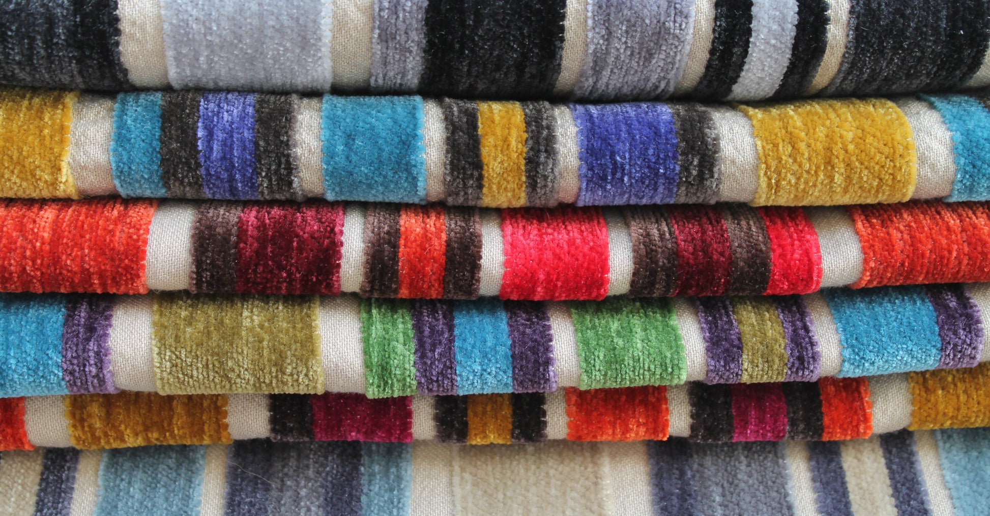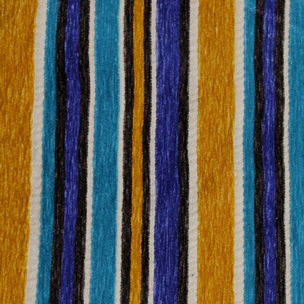 Paladin is a bold multicolor wide stripe, reminiscent of awning fabric. It differs in the texture, the stripes being a heavy brushed chenille and the background being a smooth textured cloth. This is a sold and thick fabric that should hold up really well. Polyester offers good stain resistance so cleaning should not be an issue.