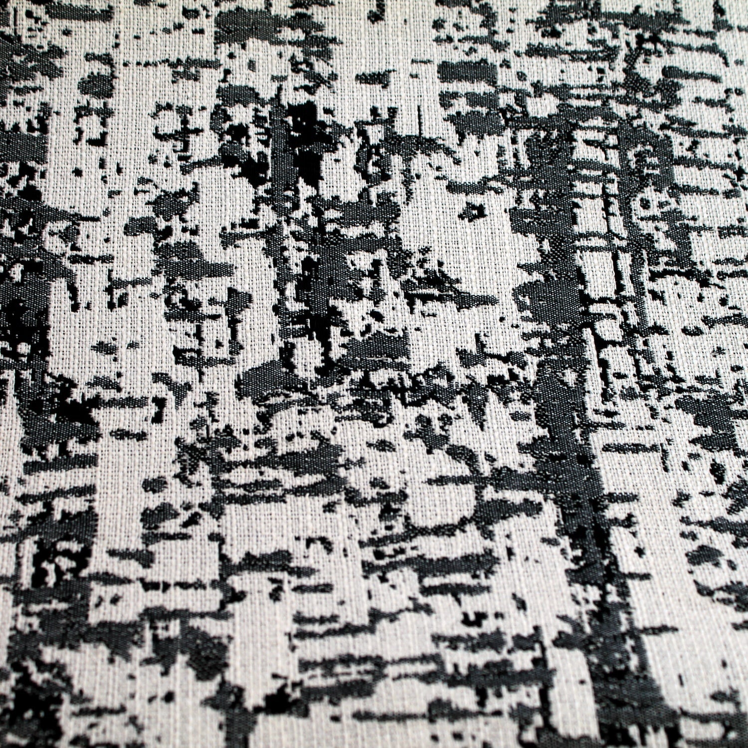 This fabric would work well in a modern setting or on retro furniture. The colour is entirely shades of cool grey to black. The off white background warms the fabric up.